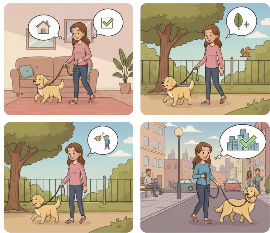 3️⃣ Świat zewnętrzny - uczysz psa radzenia sobie z otoczeniem.